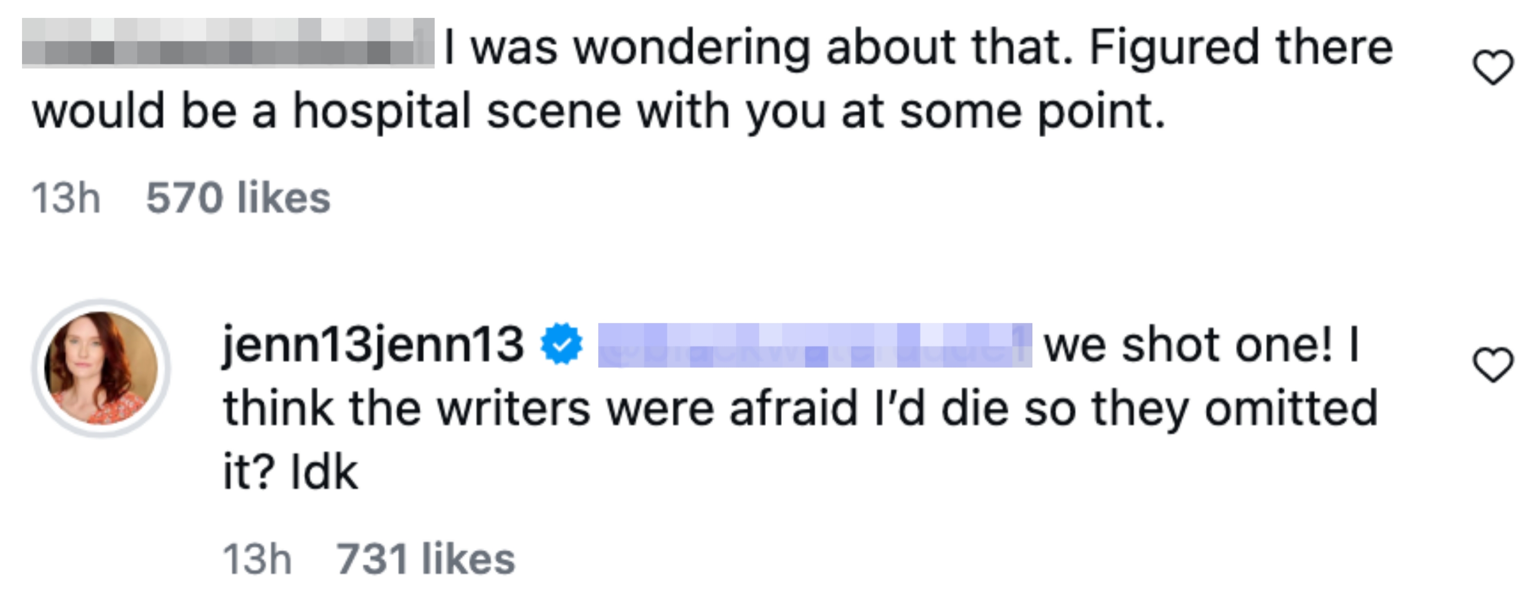 And Jennifer opened up some more in the comments. When one follower wrote: “I was wondering about that. Figured there would be a hospital scene with you at some point,” Jennifer replied: “we shot one! I think the writers were afraid I’d die so they omitted it? Idk.”