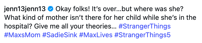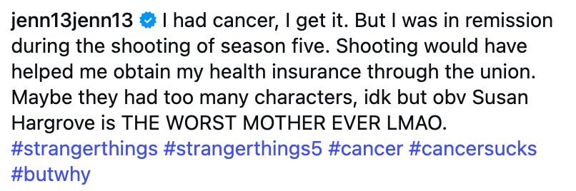 “Maybe they had too many characters, idk,” Jennifer went on. “but obv Susan Hargrove is THE WORST MOTHER EVER LMAO.” She also added the hashtags: #strangerthings #strangerthings5 #cancer #cancersucks #butwhy.