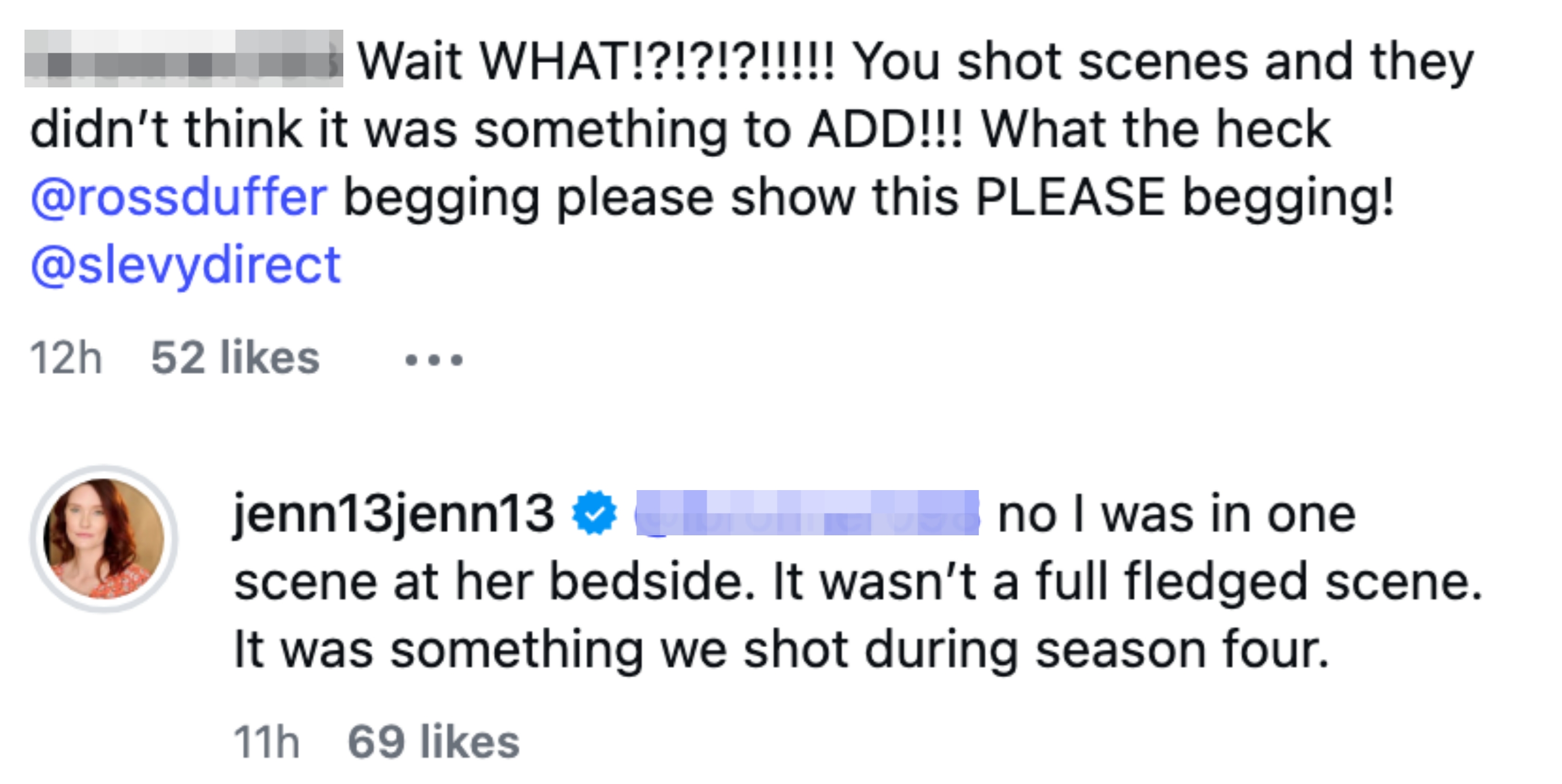 When somebody else commented: “Wait WHAT!?!?!?!!!!! You shot scenes and they didn’t think it was something to ADD!!! What the heck @rossduffer begging please show this PLEASE begging! @slevydirect,” Jennifer clarified that this footage had actually been shot during filming for Season 4. She explained: “no I was in one scene at her bedside. It wasn’t a full fledged scene. It was something we shot during season four.”