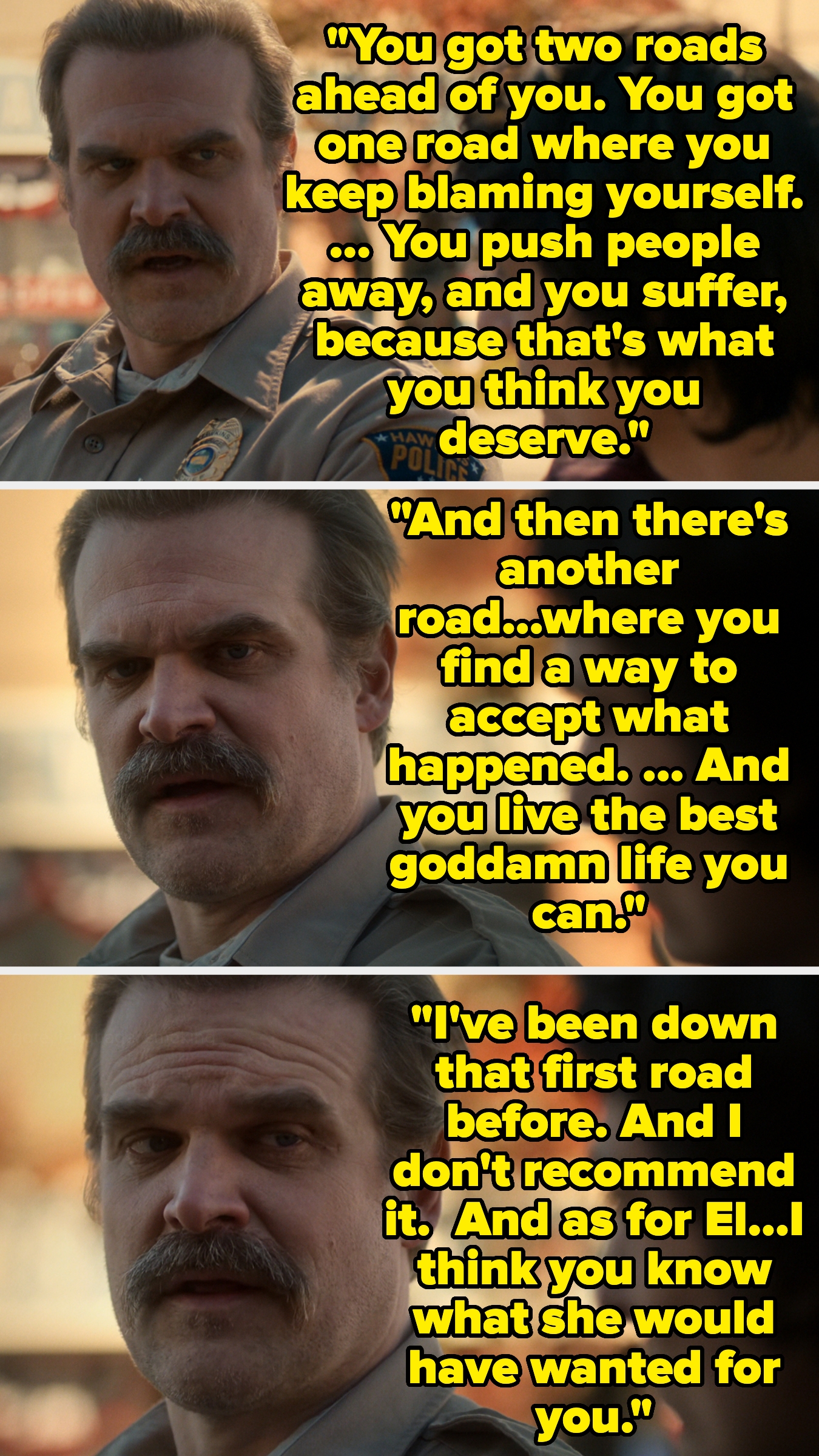 "Hopper was planning on killing himself to save El at the start of the season, and we are supposed to believe that after she dies, he just picks up and lives a normal life? Nothing about his behavior in any season prior to this leads me to believe he is rational enough to live the life she would have wanted for him. It doesn't seem to be in his nature."